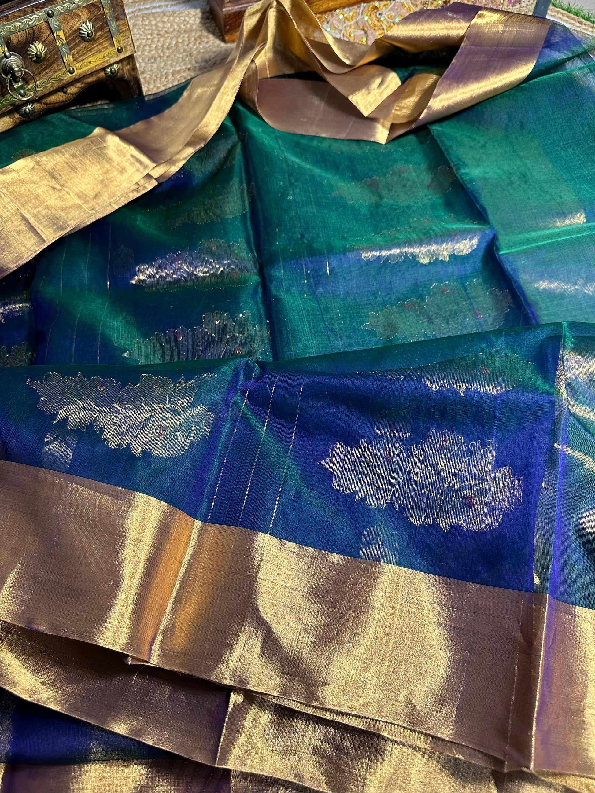Step into a world of elegance with our Emerald Noor Pattu Chanderi Silk Saree, a captivating piece that beautifully marries tradition with modern sophistication. Inspired by the majestic peacock, this saree features a stunning teal hue that radiates richness and depth, evoking the vibrant allure of nature.