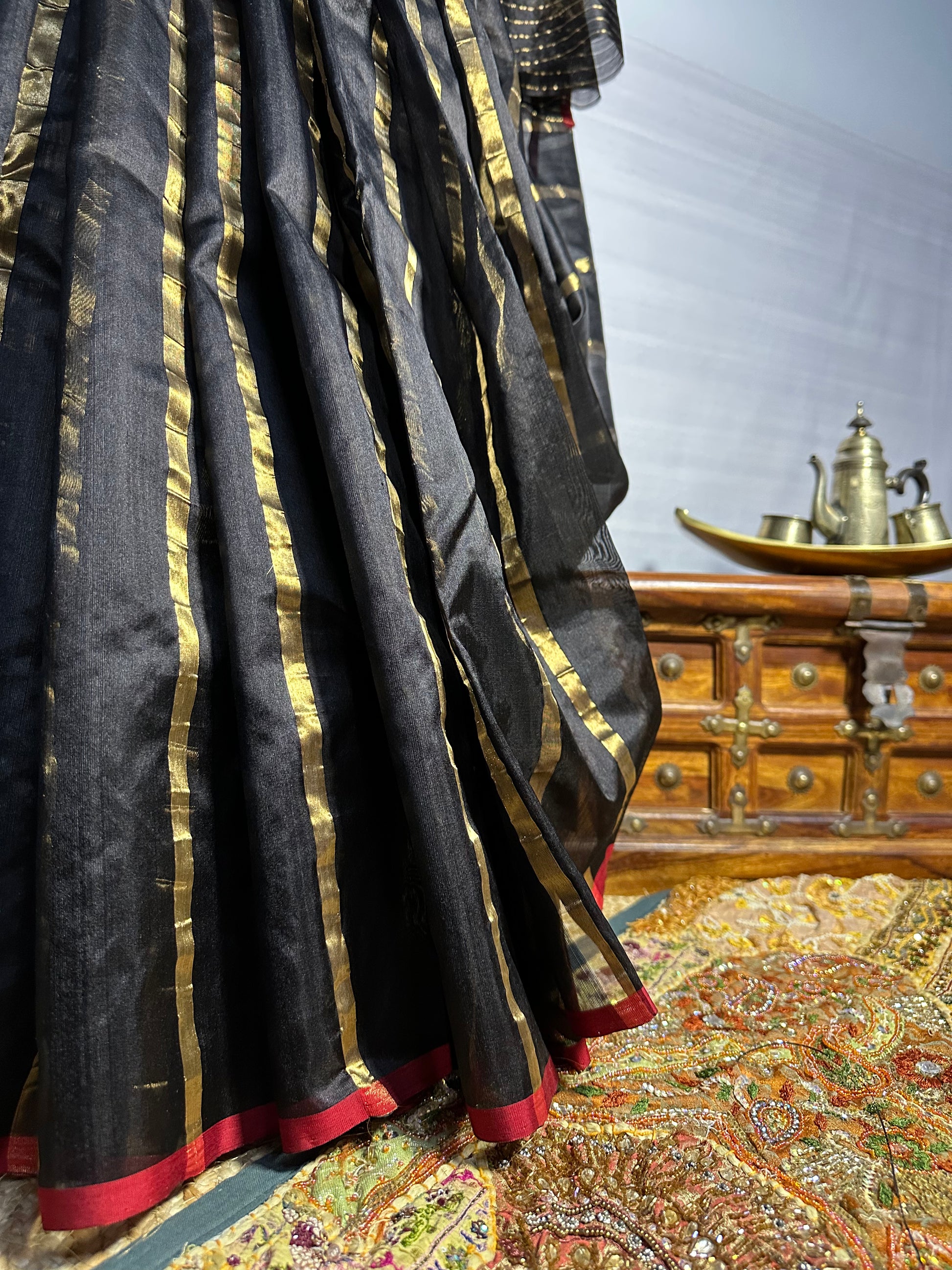 Crafted from premium Chanderi silk, the Jhalak-e-Mahal saree features a luxurious drape that falls gracefully, enhancing your silhouette with every step. The striking combination of gold, red, and black stripes adds a touch of drama and vibrancy, reminiscent of the rich tapestries found in royal residences. The intricate pattu weave not only enhances the texture but also brings out the rich hues, ensuring that you shine brightly at every occasion.