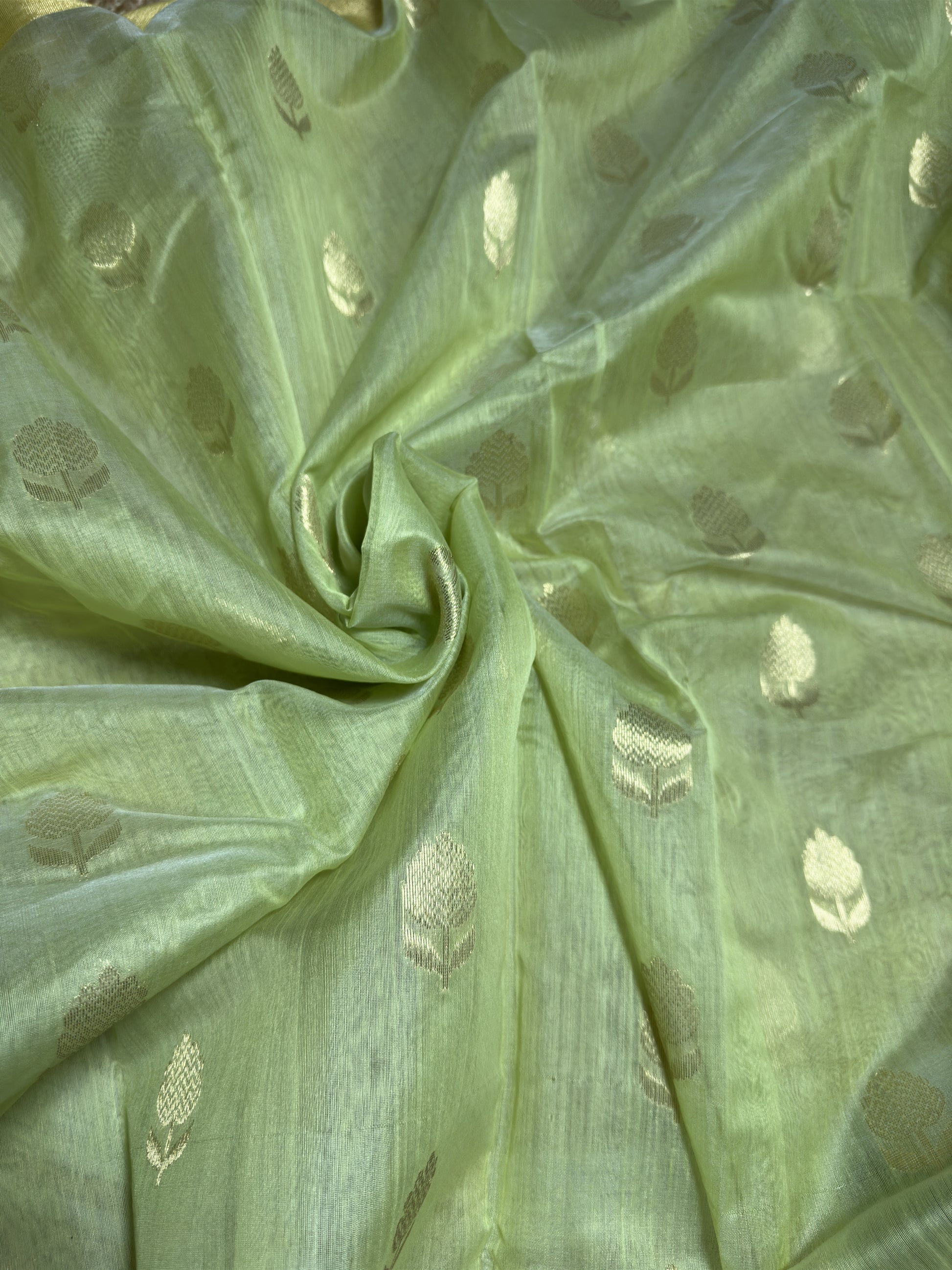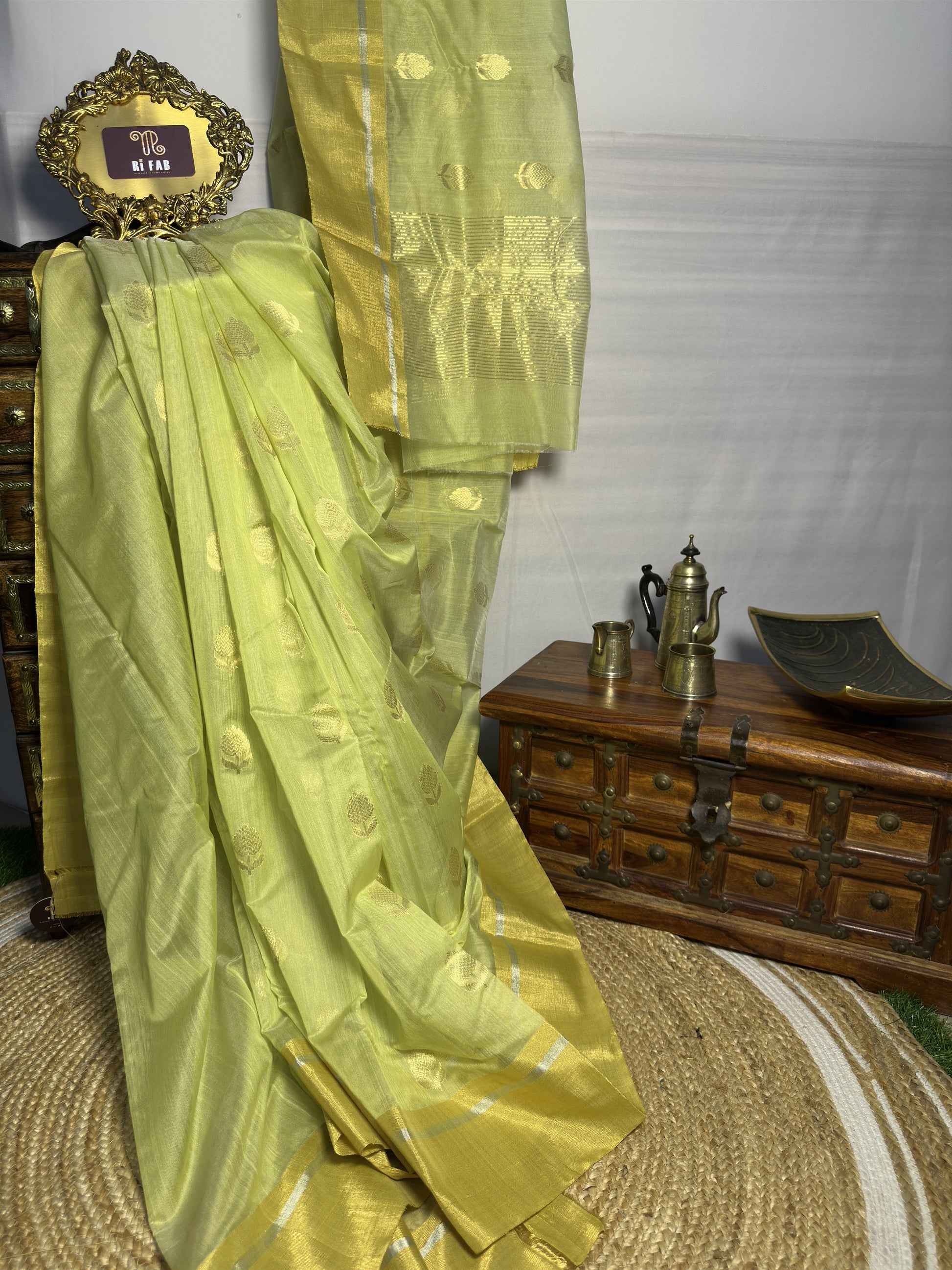 Introducing the Panna Saundarya Chanderi Silk Saree, a masterpiece that encapsulates the essence of elegance and grace. Inspired by the lush beauty of emerald green, this saree is designed for the modern woman who cherishes sophistication and timeless style.
